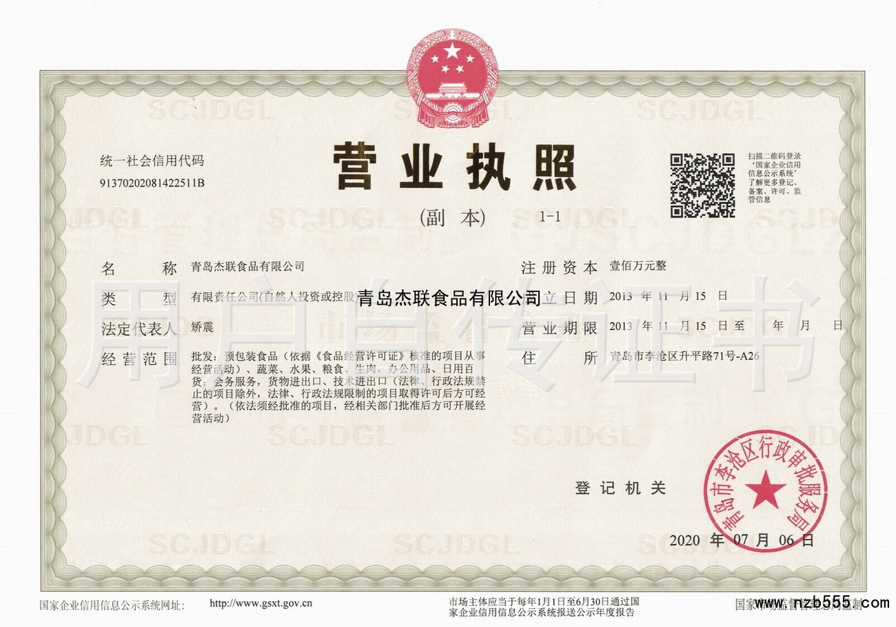 | 發(fā)證機(jī)構(gòu): | 青島市李滄區(qū)行政審批服務(wù)局 | 發(fā)證時(shí)間 : | 2020-07-06 |