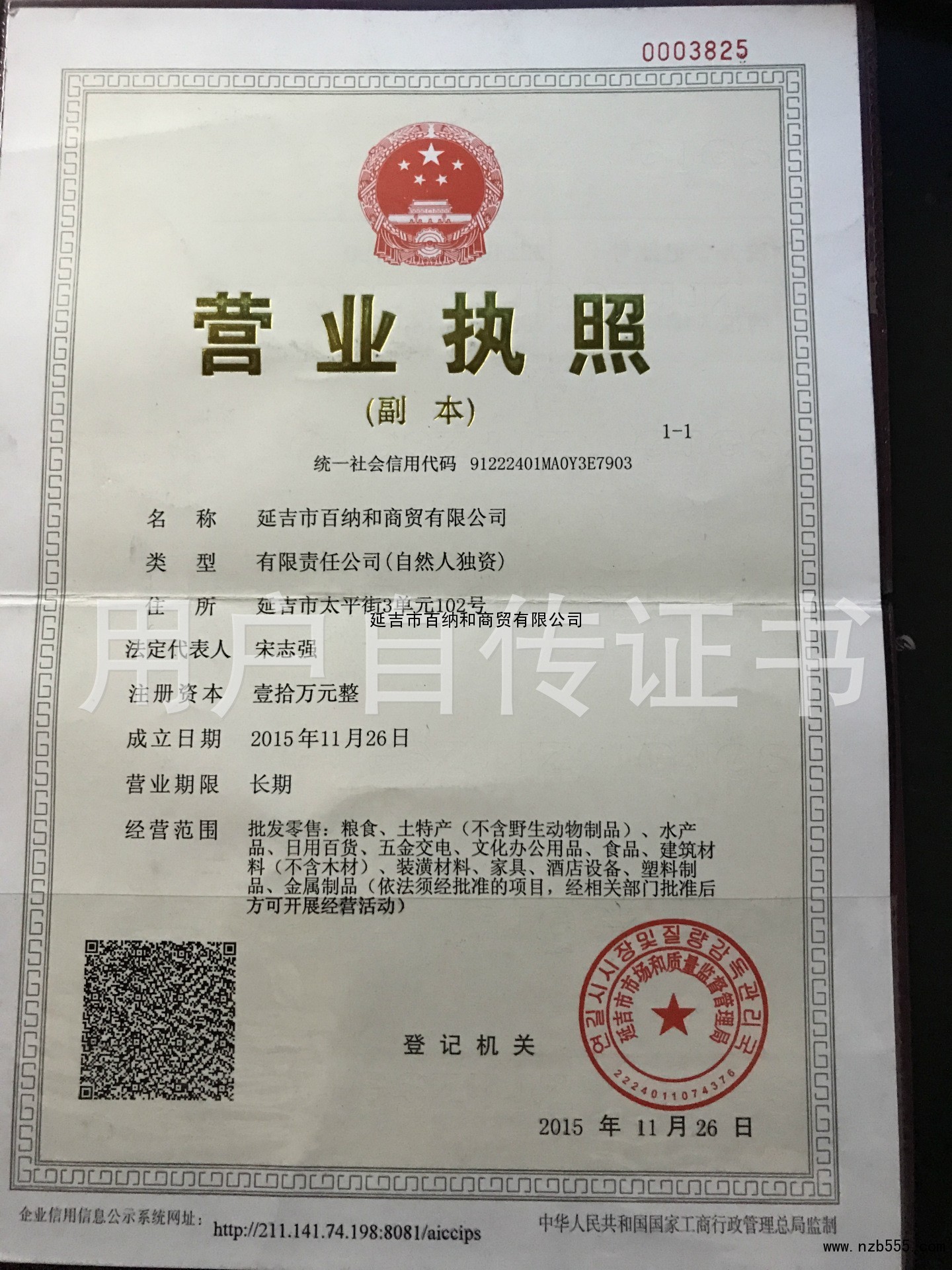 | 發(fā)證機(jī)構(gòu): | 延邊市市場和質(zhì)量監(jiān)督管理局 | 發(fā)證時間 : | 2015-11-26 |