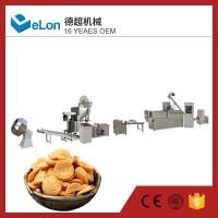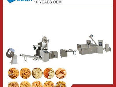 該機由供料系統、擠壓系統、旋切系統、加熱系統、傳動系統、控制系統組成。采用先進的螺桿擠壓膨化技術,利用高溫高壓將物料熟化并膨化成型,一次性完成。主機采用變頻調速,保證生產過程的穩定性。產品花色、品種多樣、外表美觀、自然逼真、質感細膩、原料使用廣泛。