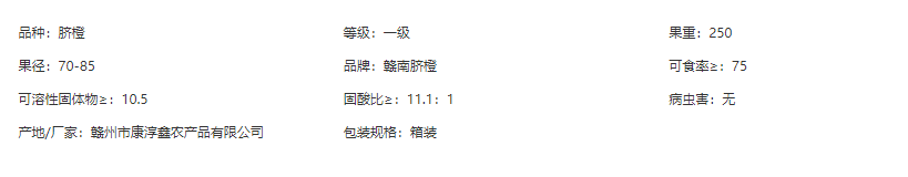 贛南臍橙果大形正,一般每個(gè)250克,橙紅鮮艷,光潔美觀,可食率達(dá)85%,顏色偏紅,比其他產(chǎn)地的橙子顏色略深;果皮光滑、細(xì)膩;果形以橢圓形多見。