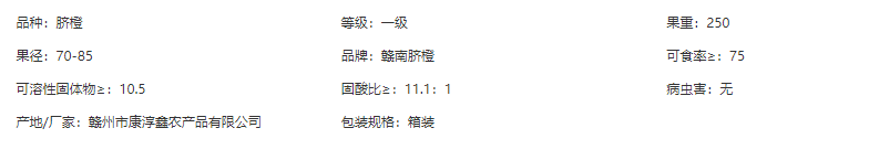 贛南臍橙果大形正,一般每個250克,橙紅鮮艷,光潔美觀,可食率達(dá)85%,顏色偏紅,比其他產(chǎn)地的橙子顏色略深;果皮光滑、細(xì)膩;果形以橢圓形多見。